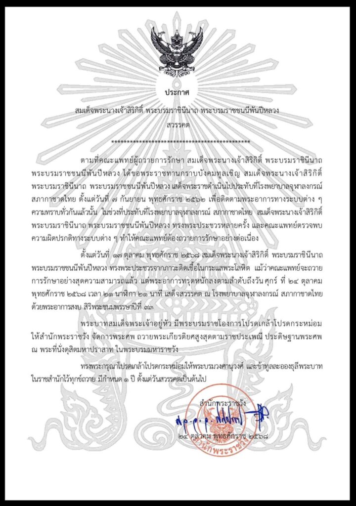 ประกาศสำนักพระราชวัง สมเด็จพระนางเจ้าสิริกิติ์ พระบรมราชินีนาถ พระบรมราชชนนีพันปีหลวง เสด็จสวรรคต